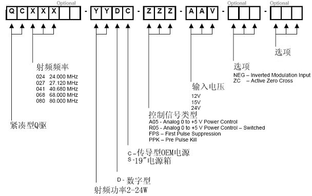 型号例子:QC041-20DC-FPS-15V,41MHz OEM型射频电源,输出20W,数字调制输入,带首脉冲抑止,要求输入直流电源15V。