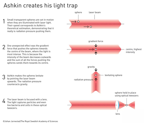 Arthur Ashkin发明了一种光学镊子,它能利用激光束手指来捕捉粒子、原子、病毒和其他活细胞。这个新的工具让Ashkin实现了一个科幻小说中的古老的科学梦想——利用光的辐射压力来移动真实存在的物体(图二)。他成功地用激光将微小的粒子向激光束的中心推进,并让它们维持在那个位置上。光学镊子被成功发明。