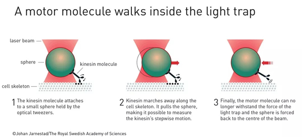 ○ 图三:光镊子使运用光来观察、转动、切割以及推拉成为可能。在许多实验室,激光镊子被用来研究生物过程,如蛋白质、分子马达、DNA或细胞内部的生命。