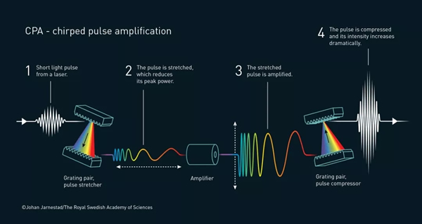 ○ 图四:Mourou and Strickland发展的技术叫做啁啾脉冲放大(CPA)。