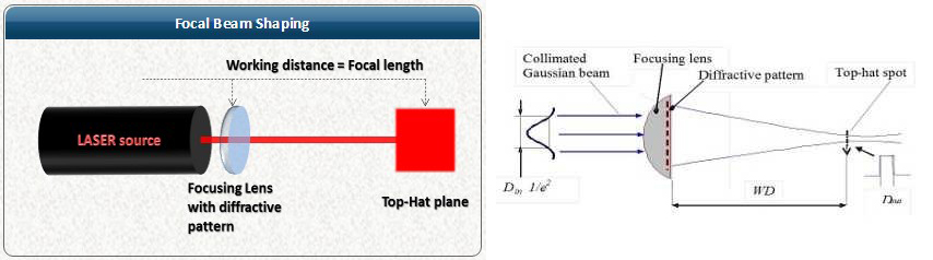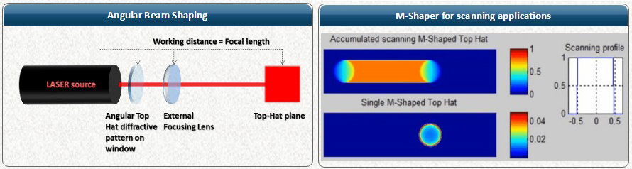 角光束整形器可在无穷远或无相差,透镜焦距位置形成平顶光分布;M整形器可产生M型强度截面,在特定工作面产生陡峭的边缘