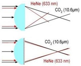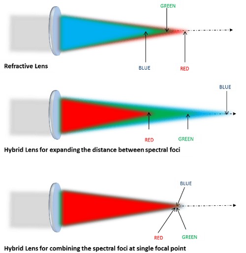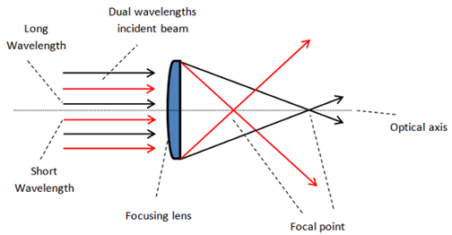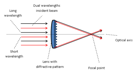 在多波长聚焦中,一般的折射透镜在不同波长间都存在一定的色散,而带有衍射面的能有效的较少不同波长之间的色散,使不同波长的光聚焦于同一位置。