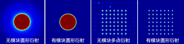 在玻璃基质上镀上极薄(~1um)的一层反射膜图案就构成了电介质模块,其中有镀膜的部分将反射入射光,在不镀膜的地方入射光通过。在近场,光形状非常接近镀膜图案,而在远场位置会出现一些衍射模式,如果在电介质模块后加入一个镜片,就可以使相平面上的衍射减到无法察觉。电介质模块可用于缩小光束整形器后光斑过渡区的大小。