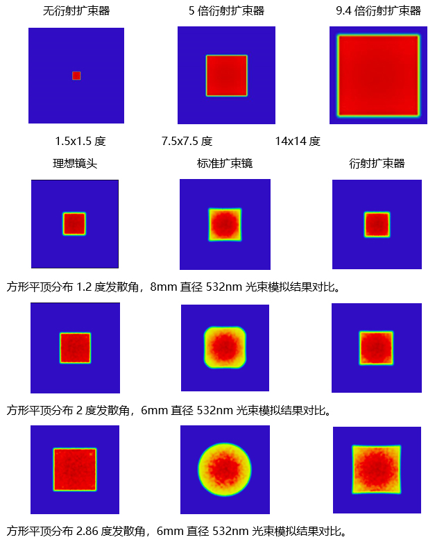 衍射扩束器能以一定倍数增加或减少衍射元件出射光的发散角和大小,相对于标准扩束器,衍射扩束器由于考虑了光束整形、光束分束和光束聚焦的特点,极大的减小了输出的光束的畸变。衍射扩束器可运用于以下应用