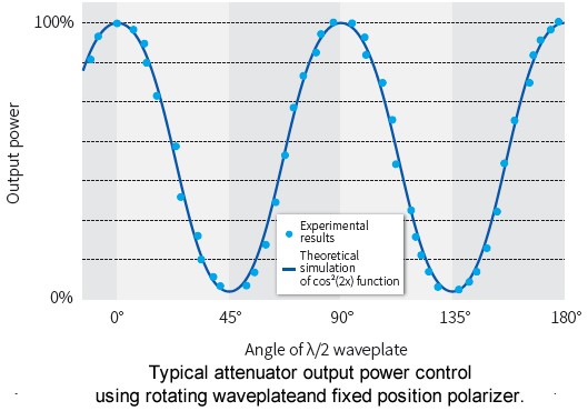 增强型衰减器包括一个石英材质的旋转λ/2相位波片和一到两个用于s偏振和p偏振的平行光束分离的薄膜偏振片。偏振片安装在一个带精密动态的可调波片的特殊设计的光机支架上。最大传输应选择p偏振,最大衰减选择纯s偏振。分离光束的强度比是通过旋转固定器中的波片来连续调节。