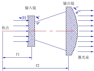 如右图所示,输入镜将入射的激光束聚焦在前焦平面上(虚焦点),新的束腰w?0 和发散角q?为(1)和 (2)(3)式中w(l)为入射激光束在入射镜上光束半径,l 是入射激光束腰与入射镜的距离,f1是输入镜的焦距。因为 w0? 落在输出镜的后焦平面上,并且输出镜的焦距f2大于输入镜的焦距,高斯光束将被扩束镜准直。准直倍率如下:(4)