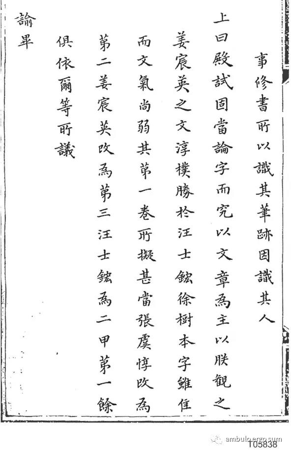 康熙三十六年七月十六日甲午戌时。殿试读卷官大学士伊桑阿等,将策试天下贡士选择十卷,进乾清宫面奏,请旨定夺。上于灯下逐一详览,阅第一卷所对河工,顾谓诸臣曰:此科题较难,故于治河未能条畅......遂命拆卷,诸臣所拟第一卷李蟠,二卷汪士鋐,三卷张(严)虞惇,四卷徐树本......上顾谓诸臣曰:诸卷文章如何?内有汝等认识者否?张玉书奏曰:第一卷尚觉条晰。韩菼奏曰:徐树本系徐元文之子,姜宸英年将七十,文甚佳,而字画不楷,故置之第七。臣与姜宸英同事修书,所以识其笔迹,因识其人。上曰:殿试固当论字,而究以文章为主,以朕观之,姜宸英之文淳朴胜于汪士鋐,徐树本字虽佳,而文气尚弱。其第一卷所拟甚当,张(严)虞惇改为第二,姜宸英改为第三,汪士鋐为二甲第一,余俱依尔等所议。(《康熙起居注》,台北故宫博物院藏,T05838)
