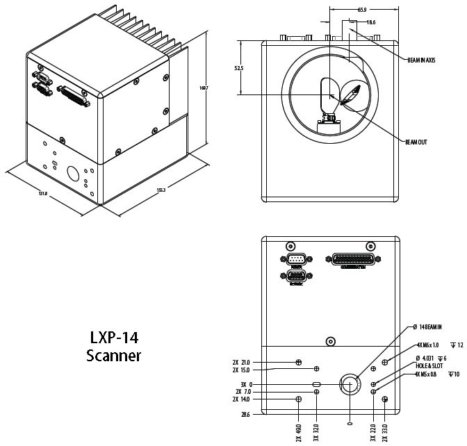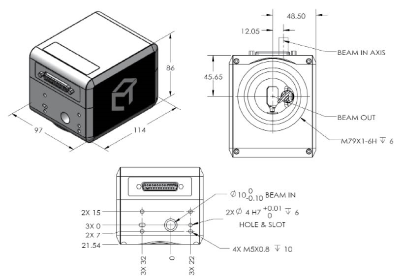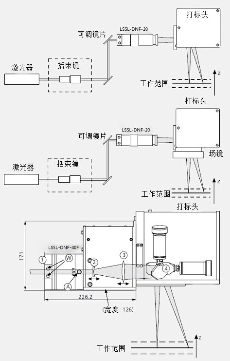 可调准直镜片由马达驱动,动态调节准直光束的发散度从而改变整个系统的焦距。扫描头密封安装,前后各有一片窗口镜片保护扫描物镜和出光孔以免除污染。所有型号都配有物镜或者预聚焦镜片。