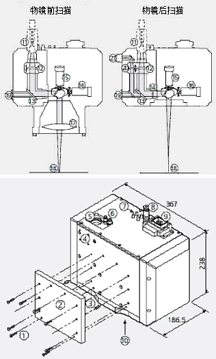 激光束用光纤传导到扫描系统水冷准直器,然后投射到两片运动偏转镜片上。在物镜前扫描系统中,位于出口处的扫描物镜将光束聚焦并投射在工作面上;而在物镜后扫描系统中,光束聚焦是由偏转镜片前的集成聚焦镜片组实现的(如上图)。