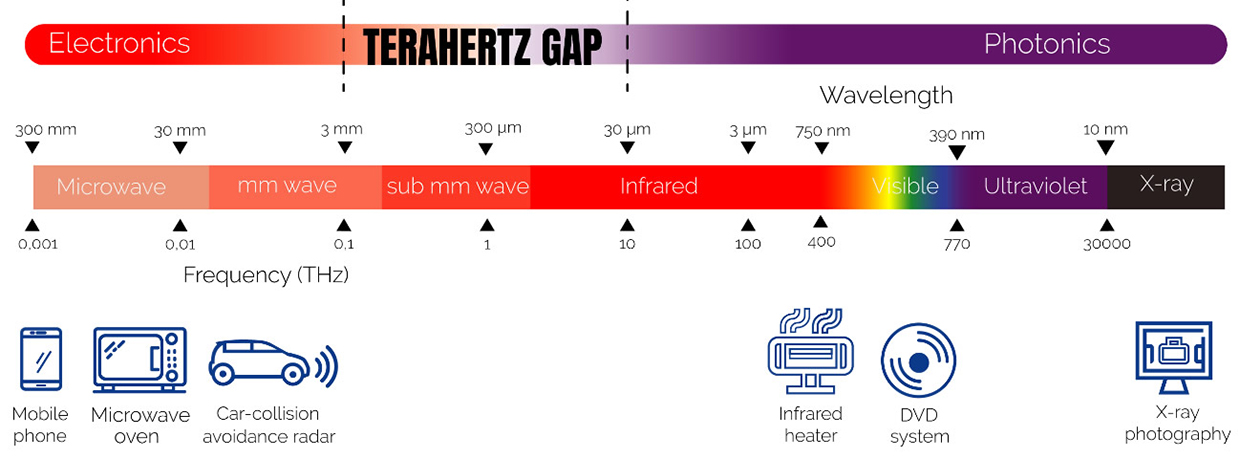 多年来我们一直利用着我们身边围绕着许多不同形式的电磁波:光波、无线电波、微波。太赫兹波(THz)是频率在100GHz到10THz之间的电磁波。太赫兹辐射位于微波和红外光谱区域之间。