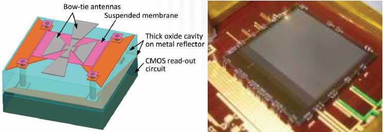 微测辐射计像素结构和天线耦合,微测辐射热计阵列传感器建立在CMOS ROIC上。