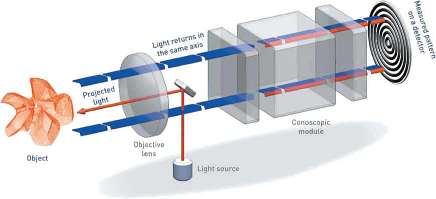 传感器产生激光光束投射到被测物体上,所有的反射光线通过物镜收集进入锥光模块对产生的干涉图样进行分析,以确定物体的距离。
